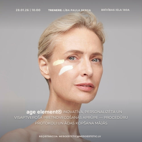 - ādas novecošanās cēloņi - pretnovecošanas risinājumi katram ādas tipam - atbilstošas terapijas metodes izvēles principi - metodes kontrindikācijas, blakusefekti - age element® procedūras praktiskā demonstrācija